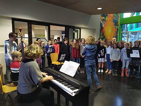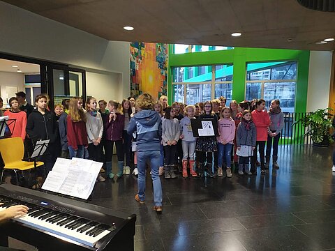 Nach kurzem Aufwärmen und v.a. Aufwachen haben die SchülerInnen der 1a und 1b drei traditionelle Weihnachtslieder gesungen. Trompete, Akkordeon, Kontrabass, Blasinstrumente und Gitarre waren als Begleitung dabei und haben gemeinsam mit den schönen Stimmen das Schulhaus in weihnachtlichen Glanz gehüllt. Damit haben sie nicht nur die Jugendlichen sondern auch LehrerInnen und Eltern so früh am Tag erfreut.