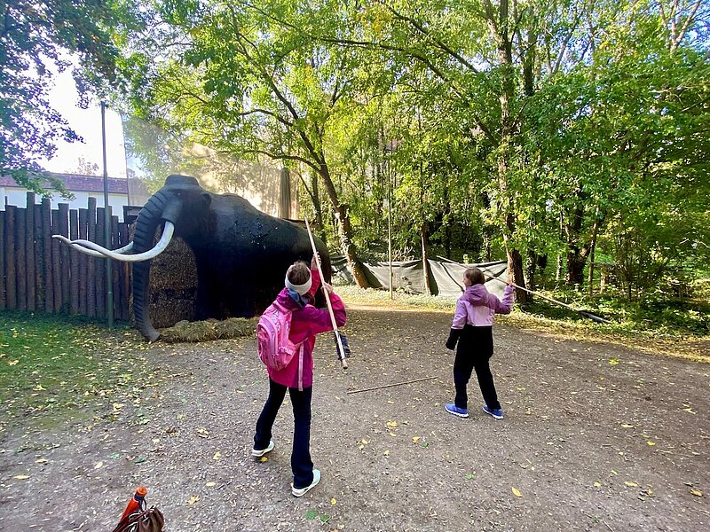 Die Schülerinnen und Schüler der 2. Klassen durften sich beim Speerwerfen als Mammutjäger beweisen, beim Feuermachen durch Funken schlagen zusehen (und das Feuer selbst löschen) sowie frisch gebackenes Brot (so wie unsere Vorfahren es hergestellt haben) verkosten.