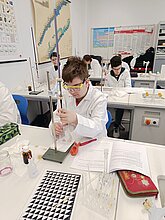 Als erstes stand die Praxis an: zuerst tüpfeln und danach eine gefährliche Titration mit Kaliumpermanganat und Schwefelsäure. Nach den zwei Stunden gab es eine entspannende Pause in einer Pizzeria im Ort. Anschließend ging es jedoch direkt mit der drei Stunden langen Theorie weiter, doch auch durch die haben sich unsere Teilnehmer tapfer geschlagen.
