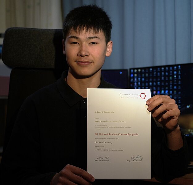 Zum Abschluss der „Junior-ÖChO“ gab es einen Kurswettbewerb, an dem 34 Schüler aus ganz Österreich mitmachten und ihr Wissen unter Beweis stellen durften. Eduard Wernisch (7C) nahm ebenfalls teil und erhielt für seine hervorragende Leistung eine Anerkennung. Bei 18,5 Punkten fehlten ihm nur 2 Punkte für den 3. Platz.