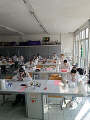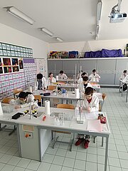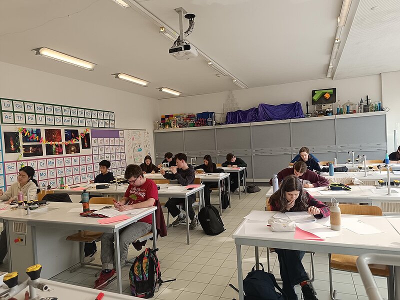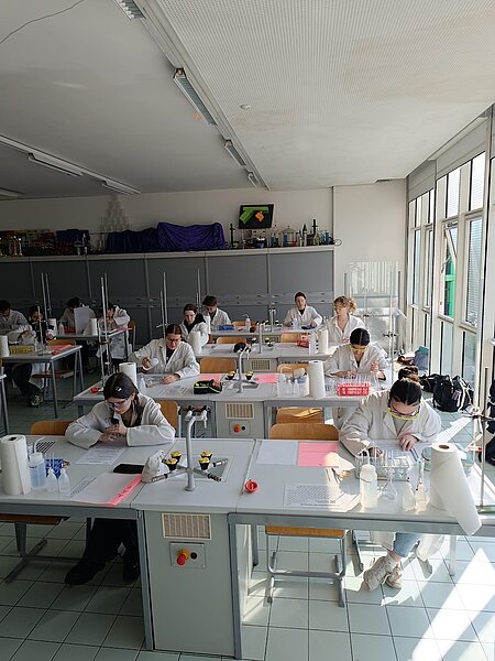 In der Praxis musste die Wasserhärte mittels Komplexometrie bestimmt werden. Dabei nutzt man aus, dass sich ein Indikator verfärbt, sobald sich keine freien Calcium-Ionen mehr in Lösung befinden, welche in den synthetisch hergestellten Proben die einzigen, für die Wasserhärte verantwortlichen, Ionen waren. Weiters musste, wie schon letztes Jahr, mittels einer Säure-Base-Titration die Konzentration einer Magensäure (Salzsäure) bestimmt werden.