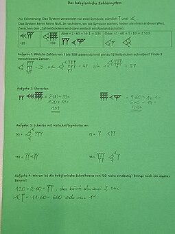 Wir erkundeten das Zahlensystem der Mayas, das auf der Grundzahl 20 basiert und – neben den Babyloniern – zu den ersten gehörte, die ein Symbol für die Null entwickelten. Ebenso lernten wir das babylonische Zahlensystem mit der Grundzahl 60 kennen; beeindruckend ist, dass ihre Rechnungen, einst mit Griffeln in weiche Tontafeln gedrückt, noch heute – rund 3800 Jahre später – erhalten sind.