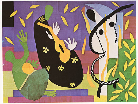 Gegen Ende seiner langen Karriere als Maler, Bildhauer und Lithograf erkrankte Matisse schwer und war nicht mehr in der Lage, lange aufrecht zu stehen oder einen Pinsel zu führen. Derart eingeschränkt, entwickelte er in dieser späten Phase seines Lebens - er war beinahe 80 Jahre alt - die Technik, mit der Schere Formen direkt in buntes Papier zu schneiden. Die ausgeschnittenen Formen arrangierte er mithilfe seiner Assistentinnen, bis ein plastisches Bild entstand, das sich spannungsvoll zu einer figürlichen oder abstrakten Komposition fügte. »Mit der Schere zeichnen« nannte Matisse seine neu entwickelte Technik.