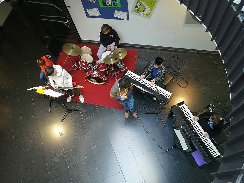 Seit Beginn des Schuljahres probt die Schulband eifrig, um bei Pausenkonzerten und anderen Anlässen ihr musikalisches Können zum Besten zu geben. Der erste Überraschungs-Auftritt in einer großen Pause hat bereits mit vollem Erfolg stattgefunden.