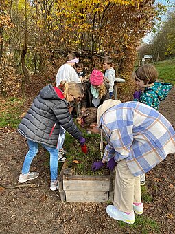 Dabei suchten sich die Schülerinnen und Schüler zunächst in Kleingruppen einen kleinen Bereich aus, auf dem sie ihr Blumenzwiebeln pflanzen wollten. Unter fachkundiger Anleitung der Naturparkleiterin DI Gabi Orosel, begannen einige sofort Löcher in unterschiedlichen Ausmaßen auszuheben. Andere legten sich erst einmal die Zwiebeln in der gewünschten Anordnung auf das Gras und begannen dann nach intensiver Diskussion mit den Erdarbeiten.