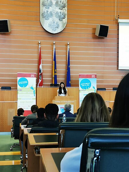 Am 18.4.2023 fand im Landhaus St. Pölten der Redewettbewerb Sag´s Multi statt, bei dem unsere Klassenkameradin Göksel Cansu Capan ins Finale gekommen ist. Über das Thema „Dafür bin ich stark!“ musste man in zwei Sprachen eine Rede halten. Sie hat in ihrer Rede zwischen Deutsch und Russisch gewechselt.