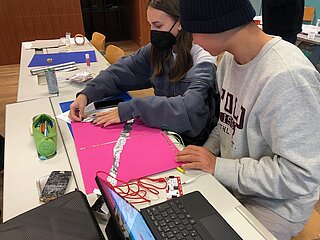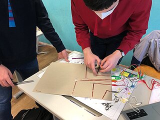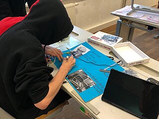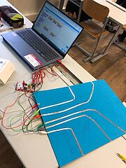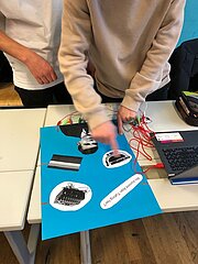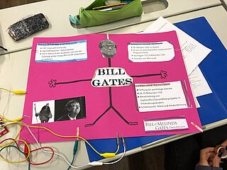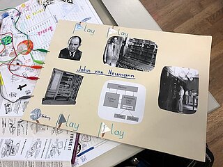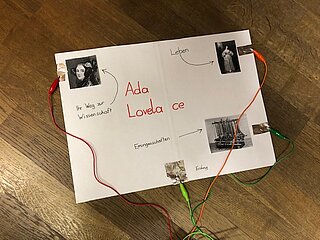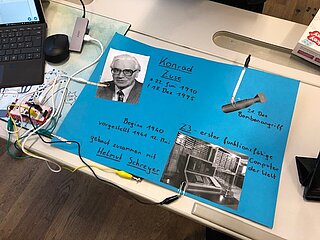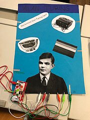 Daraufhin haben die SchülerInnen zu den in der Doku berühmten Persönlichkeiten, welche die Informatik geprägt haben, recherchiert. Ihre Ergebnisse haben sie in 2er-Teams auf einem Poster visualisiert. Das Besondere an diesen Postern ist, dass es wie sonst üblich keine gewöhnlichen Plakate sind, sondern interaktive, d.h. wird ein Button/Bild auf dem Poster gedrückt, werden die von den SchülerInnen selbst erstellten Audios abgespielt, die aus dem Leben der berühmten Persönlichkeiten Ada Lovelace, Konrad Zuse, Alan Turing, John von Neumann und Bill Gates erzählen. Die Interaktivität wurde unter Einsatz einer Leiterplatine und dem Programmierwerkzeug “Scratch” erstellt.