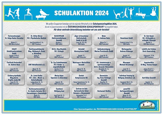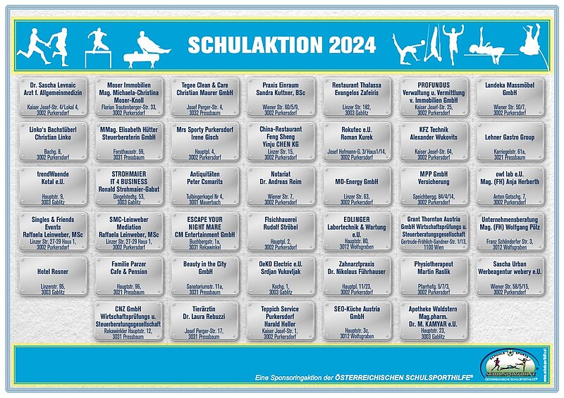 Neben Fußbällen, Tischtennissets oder Volleybällen, wurden auch Gymnastikmatten, sowie viele weitere Materialien gekauft. Wir bedanken uns sehr herzlich bei der Schulsporthilfe und den Sponsoren in der Region Purkersdorf für die tolle Unterstützung, welche uns im Bewegungs- und Sportunterricht viele neue Möglichkeiten schafft. Die Sponsoren sind auf den Fotos ersichtlich 🙂