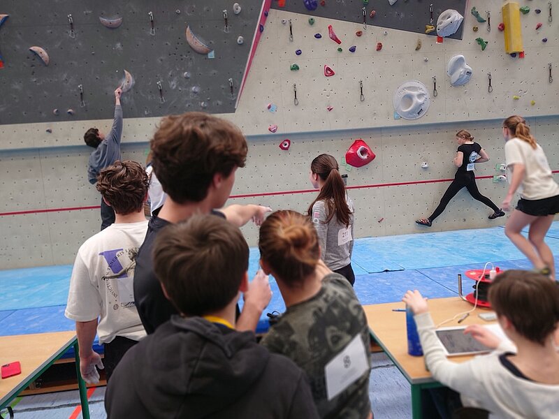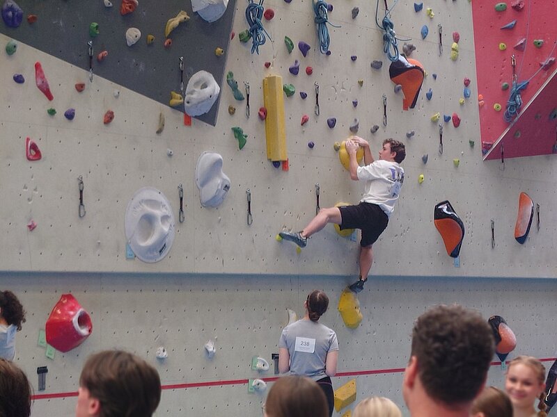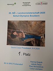 Am 9.April fand im Gymnasium Sacre Ceur in Pressbaum die Landesmeisterschaft im Schulbouldern statt. Unsere Schule wurde von motivierten Schülerinnen und Schülern aus der Unterstufe und Oberstufe vertreten. Das Unterstufenteam konnte sich dabei mit herausragenden Leistungen gegen 22 andere Teams durchsetzen und zieht so ins Bundesfinale ein, das im Mai stattfinden wird. Auch unser Oberstufenteam zeigte großartige Boulderperformances und konnte sich so den 4. Platz sichern.