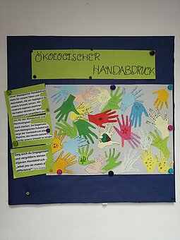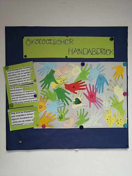 Im Gegensatz zum ökologischen Fußabdruck zeigt dieser unseren positiven Einsatz für den Klimaschutz. Die Schüler:innen haben sich ihre persönlichen Handlungen und Aktivitäten überlegt, die sie tagtäglich für unsere Umwelt in die Tat umsetzen, und diese in ihrem eigenen Handabdruck niedergeschrieben.