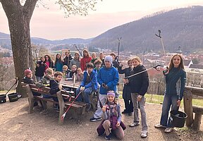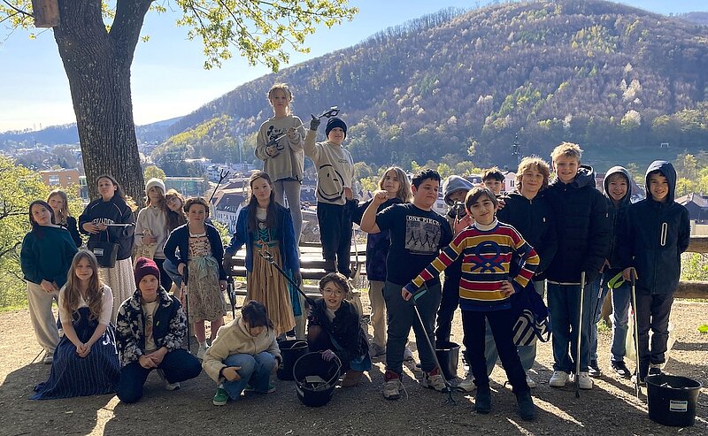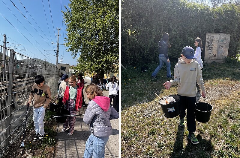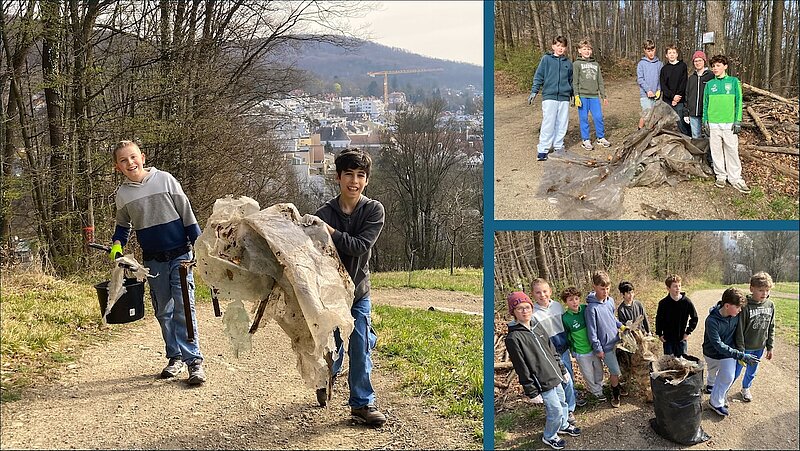 Auf dem dem Weg zur Feihlerhöhe waren die Kinder bereits sehr gut beschäfigt: hunderte Zigarettenstummel wurden eingesammelt. Oben angekommen entfernten die Kinder säckeweise Plastikplanen aus dem Wald und transportierten mühselig große Eisenstangen und -räder den Hang hinunter. Doch auch in Richtung Wintergasse, um den Käfig, das Schulgebäude und vor allem im Sparbereich wurde fleißig Müll gesammelt. Für zusätzliche Freude sorgte bei allen der regelmäßige Fund von Pfandflaschen, deren Erlös in die Klassenkassen fließt.